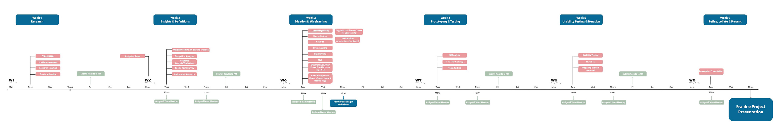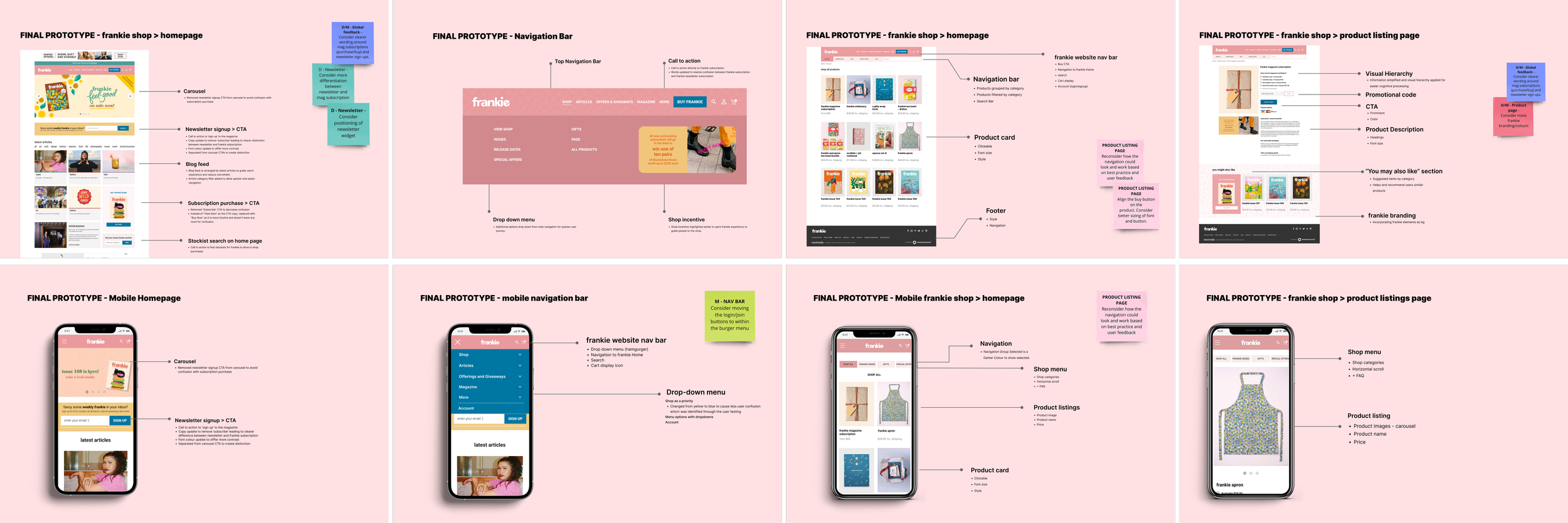 The first 2 weeks of the project were dedicated to discovery. Including background research, competitor analysis, heuristic evaluation and usability testing on frankie's homepage and shop.