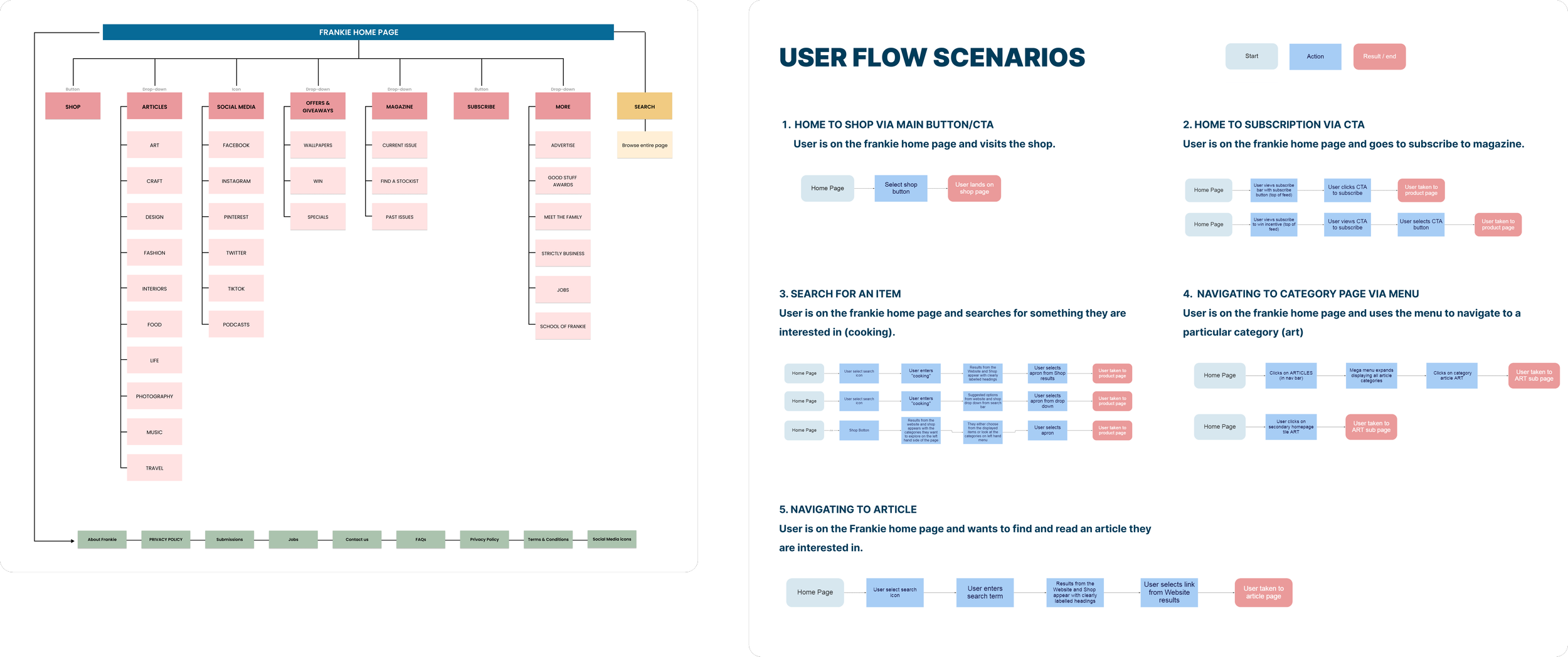 From the first round of user testing and the insights collected in the card sorting exercise an opportunity rose to design a more comprehensive navigation plan by grouping categories appropriately. Basic linear user flow scenarios were also drafted to guide us through the process.