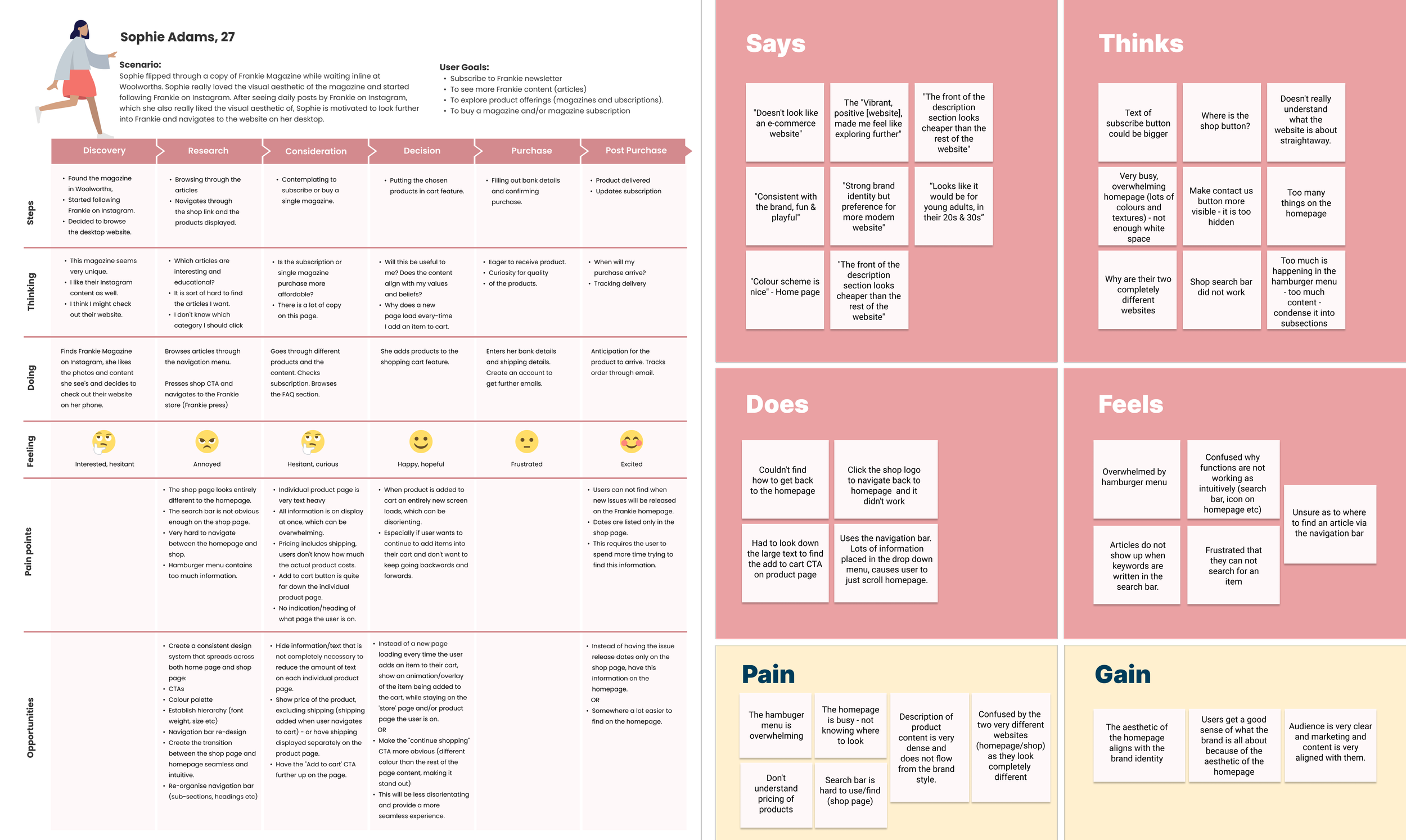 Empathy and customer journey maps were created to synthesise insights from a human centred perspective and to help us understand the interaction and experience users were having navigating frankie's website and shop across various activities.